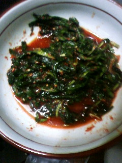 a6f32adc.JPG 「日高屋」ってチェーン店の中華屋があって、リーズナブルが売りみたいな店なんだけど、そこのニラキムチはかなりヤヴァい。辛さも匂いも相当キツくて、それだけを食うと毛穴が開きそうになる。でも酒か飯と一緒に食うと旨いんだこれが。ちょっとやみつきになっている。辛いもん好きの人にお勧め。