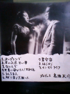 「めくるめく」「苦い記憶、甘い夢」「10年」のワイセッツナンバー、奥田民生の「歯」に触発されて作ったちょっと卑猥な「目」、ダメ人間のうた「臨時休業」、ビートルズの日本語意訳カバー「イン・マイ・ライフ」というリスト。歌うとか叫ぶとかいった原初的な行為が今の俺にとって何より必要な事だ。かといって全裸で公園で叫ぶわけにもいかないので、なんでもいいからライブやりてぇなぁ。