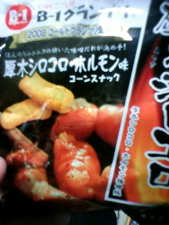 B級といえば自ら「B級ご当地グルメの採点B-1グランプリ授賞」を謳い文句にしてるスナック菓子「厚木シロコロ・ホルモン味」コーンスナック(写真参照)。これはまさにB級な味。墨の焦げた風の香り、ニンニクと味噌ダレの味、律義に再現されたシロモツの形状、しかしどこまでいっても駄菓子は駄菓子感は否めない。当たり前か。まあすぐになくなるんだろうな。