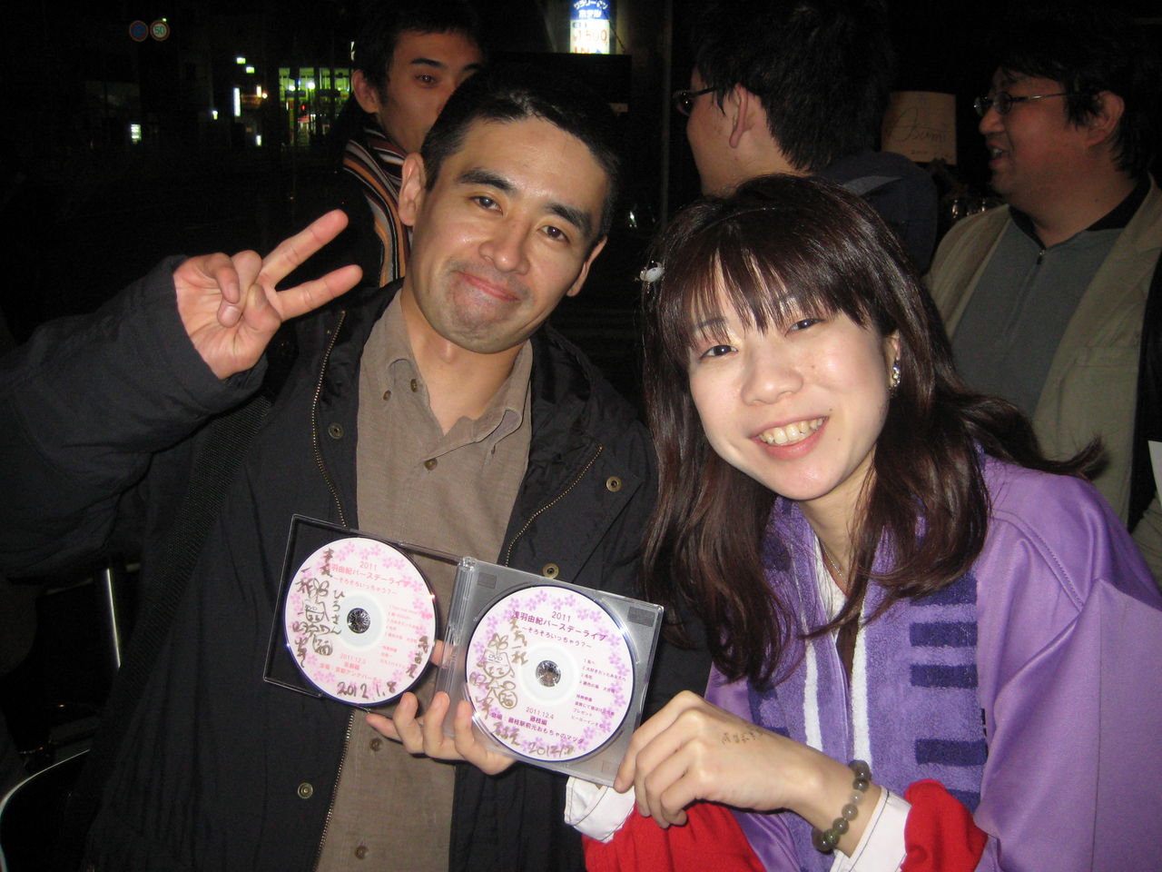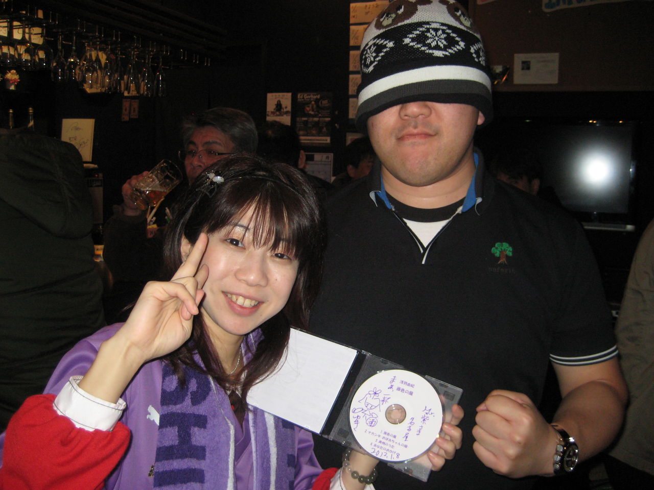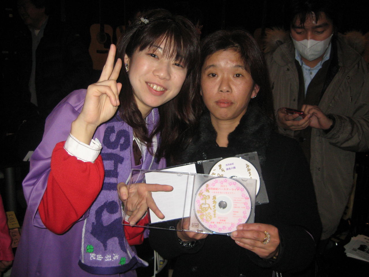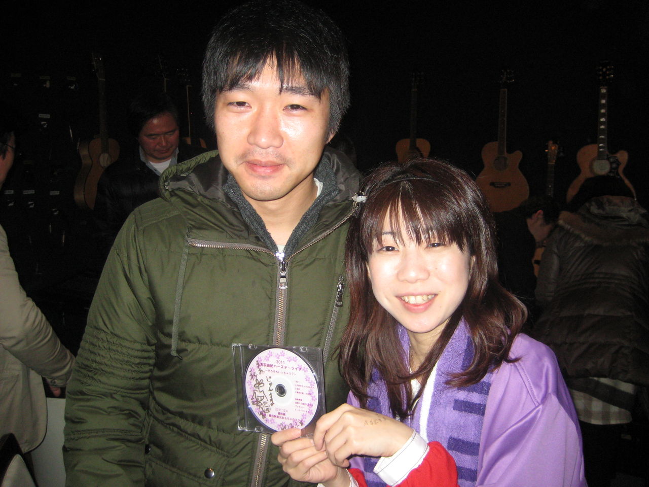 静岡からかけつけてくださいました。バースデー藤枝ライブDVDご購入。じゅんさんの笑顔に癒されます。でも合コンのこと話すといやがるので、思わずもっと言いたくなります。私のカチューシャのお返しは14日となっていますが、きっと会場ではつけてみていてくれるはずだと・・・信じています(笑 冗談はおいて、いつも本当にお世話になってます。これまでも東京・川崎・静岡ライブとお越し頂いています。本当にありがとうございます!