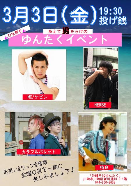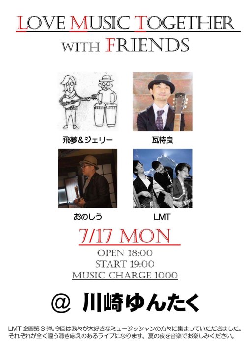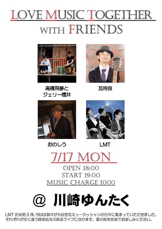 わーい(≧▽≦)!7/17(祝・月)川崎 沖縄そば「ゆんたく」ライブ!◆だいやまーく出演:Love Music Together/高橋飛夢とジェリー櫻井/おのしう/待良 #川崎 #沖縄料理 #ライブ