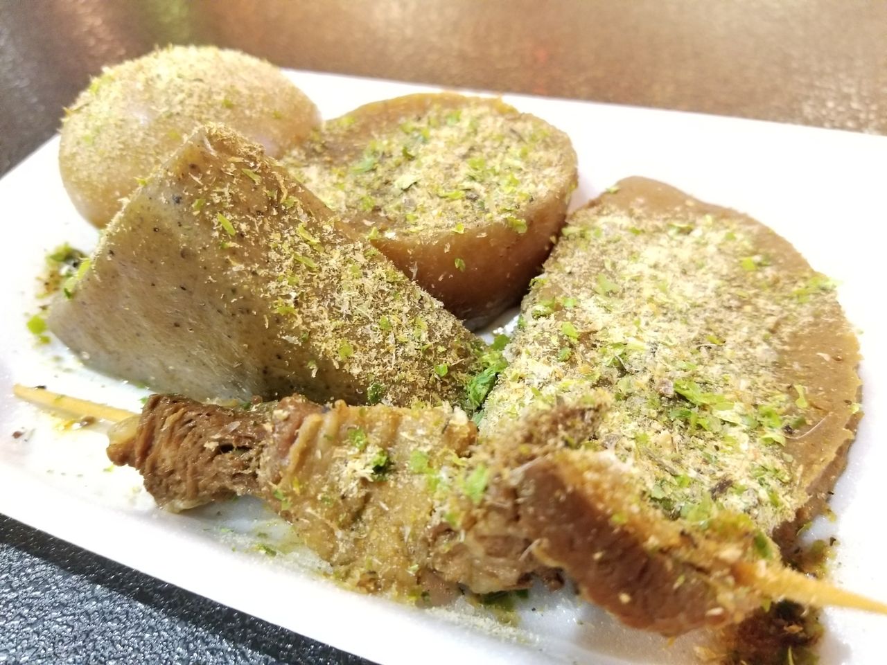 静岡ならでは 牛すじでとった黒いスープ 黒はんぺん 出汁粉をかけて食べる しぞーかおでん