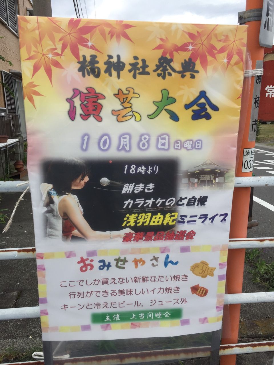 - 【ライブ情報☆彡静岡藤枝上当間】2017年10月8日(日)上当間 橘神社祭典「演芸大会」★浅羽由紀19:00頃の出演??地元のほっこりお祭り 観覧無料!一般のご参加大歓迎♪ぜひ??