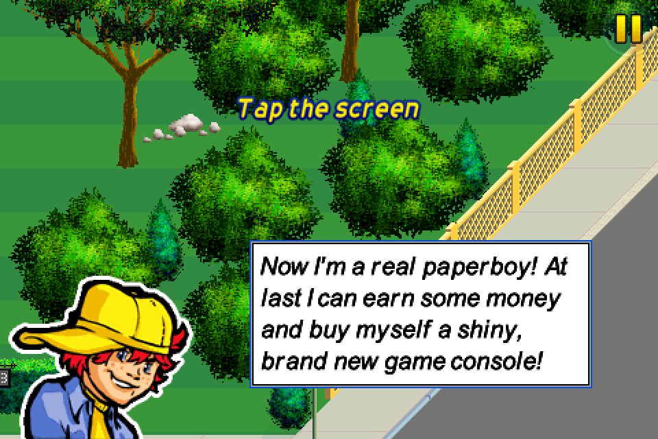 (ストーリーモードの冒頭。主人公の新聞少年が、お金をためて新しいゲーム機を買うんだと怪気炎をあげています)