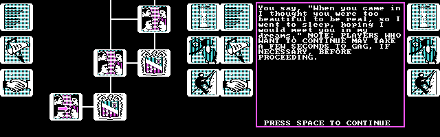ゲームとしては、ファミコンの「ロー・オブ・ザ・ウェスト」のように、プレイヤーは選択式の対応を選び、PC側の回答を楽しむ、というものなのですが、テーマが「人生」だけに、いろいろ考えさせられるものがあります。全体的なトーンとしては、けっこうユーモラスな感じなのですが、それはプレイヤーが深刻に受け止めないようにするための配慮なのではないか、という気もします。