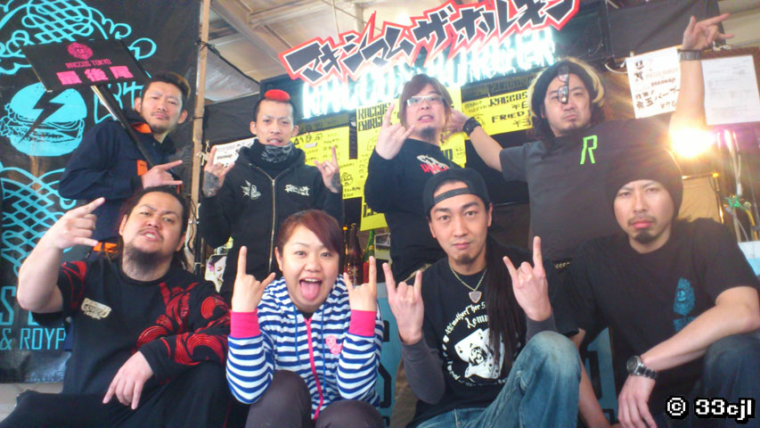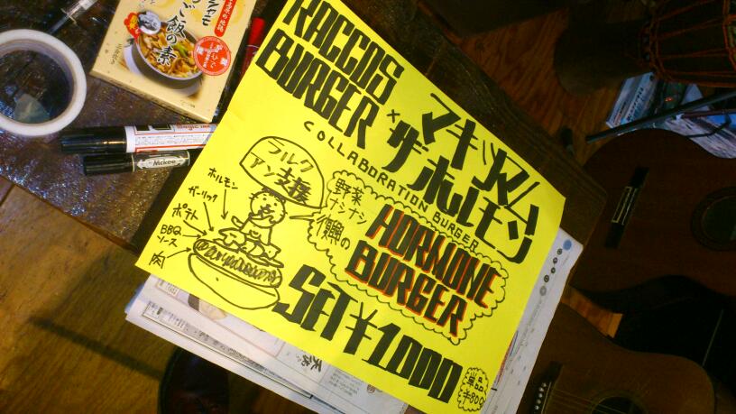 Hi-STANDARDやBRAHMANなどのバンドのPAを担当している一見怖いように見えて実は人情深くてアツい、けどちょっと怖い(笑)西片さんが代表を務めるPA集団【SPC peak performance】が立ち上げた東北三陸沖沿岸地域にライブハウスを建設して「人と人を繋げる」ためのプロジェクト【東北ライブハウス大作戦】のサポートの一環として、震災後から被災地での炊き出しや瓦礫撤去活動を行なってきた「PANTS SPRING 2012 in 東北」にも出演する奇天烈ファストコアバンドfrom岡山「IdolPunch」のVo.Raccoさんが店主のハンバーガーショップ【RACCOS BURGER】とBRAHMANの所属するtactics recordsによりハンバーガーショップ【RACCOS TOKYO】を期間限定で営業することになり、ホルモンも少しでも復興への力添えができればと思い、1日店長をやらせてもらいました。