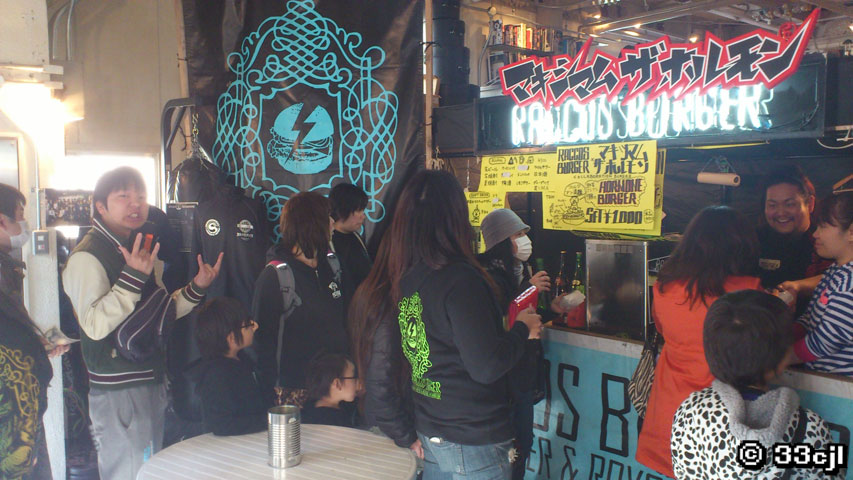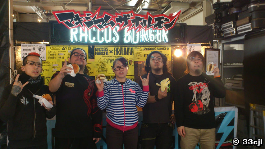 通常は、具材に茨城県産のホウレン草などを使用したRACCOS ×ばつBRAHMANコラボバーガー【復興の鬼玉バーガー】を販売してたんやけど、ホルモンが店頭に立ったこの日は特別に、具材にホルモン・ガーリック・ポテトチップ・BBQソース・肉を使用したRACCOS ×ばつマキシマム ザ ホルモンコラボバーガー【野菜ナシナシ 復興のホルモンバーガー】を販売!