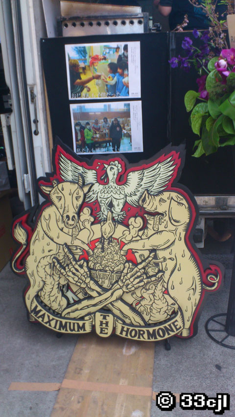そんなメニューがいろいろ貼られアメリカンテイスト溢れる店内に、昨年『グレイテスト・ザ・ヒッツ 2011〜2011』をリリースした際、タワーレコード店頭で使用していたCDジャケットの三肉エンブレムのオブジェとホルモンロゴを持ち込んで、この日はさらにホルモン色をブレンド。