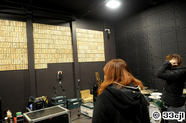 ライブハウスのホール内の壁には、東北ライブハウス大作戦に賛同いただける方に1口5000円での募金協力をお願いしてて、募金してもらった方の名前を木札に記載して、それを張りつけて宮古・大船渡・石巻のライブハウス内の壁を皆からの木札で作っていくという木札作戦によって募られたたくさんの木札がビッシリ。