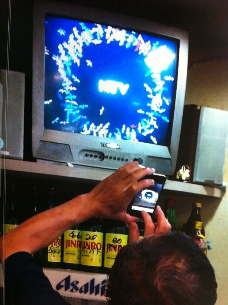 ↓この時点でのテレビ。アナログ放送の最後をカメラに収めるマスター。