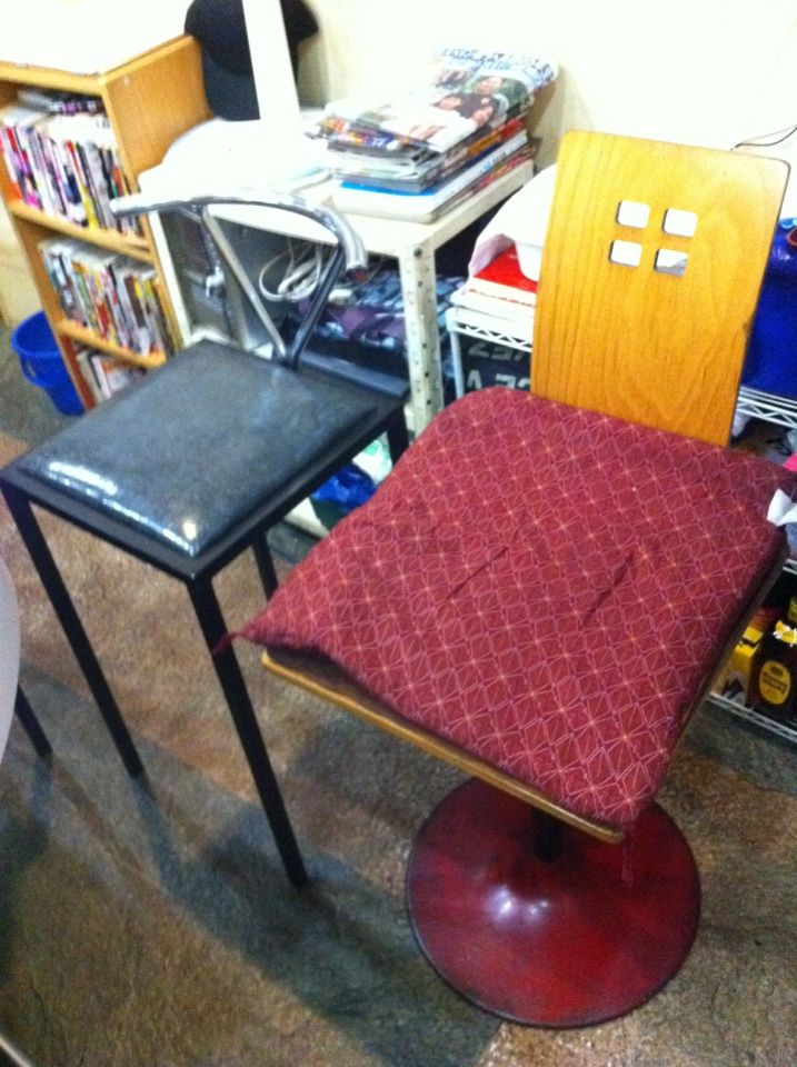 二種類のイス。左が元六本木のスナックのイス。右が元グラグライス。さ、あなたはどっち派?