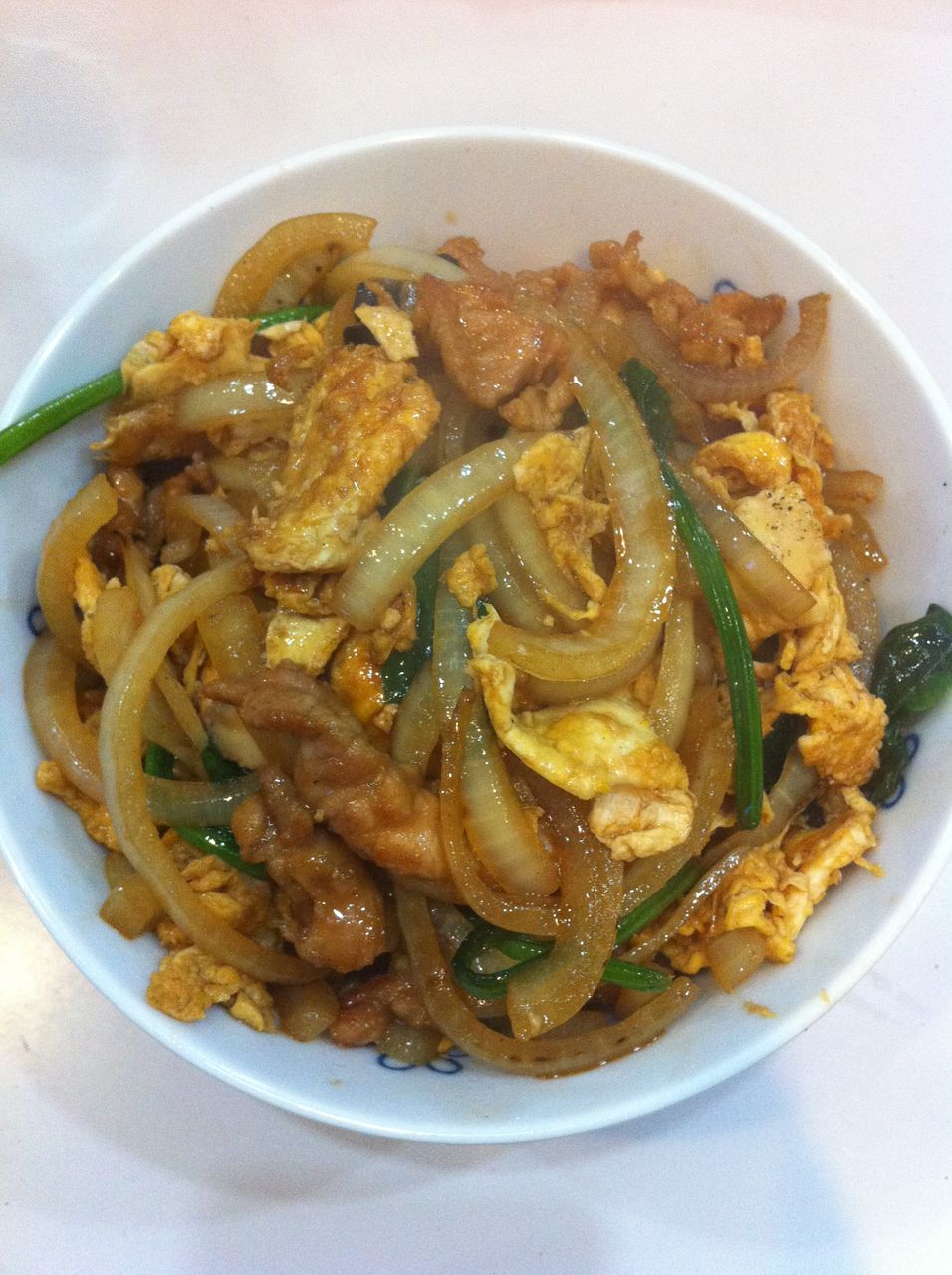 豚肉と玉ねぎの玉子炒め「かあさん丼」です。