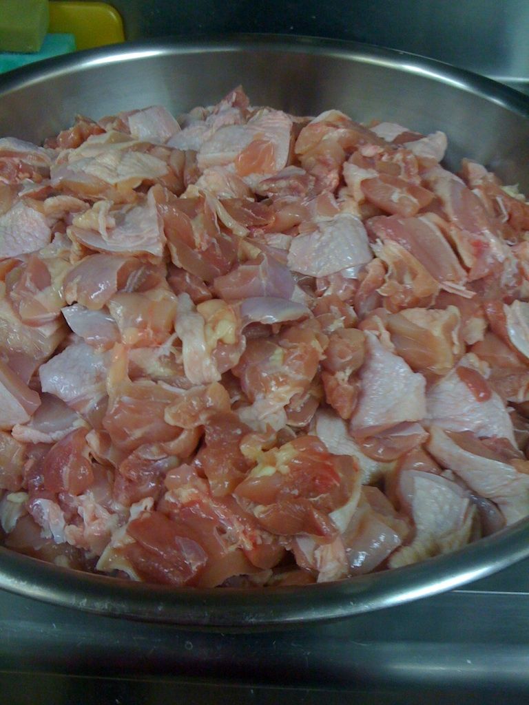 鶏の唐揚げは府中競馬場のお店の人気メニュー! この大量の鶏肉を唐揚げにするマスター。味付けだけでも相当な「腕」がいるそうです。(府中の店の厨房にて)