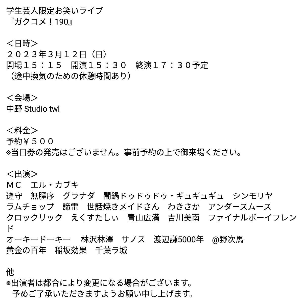 【時間】 12:30開場/13:00開演/15:00終演予定