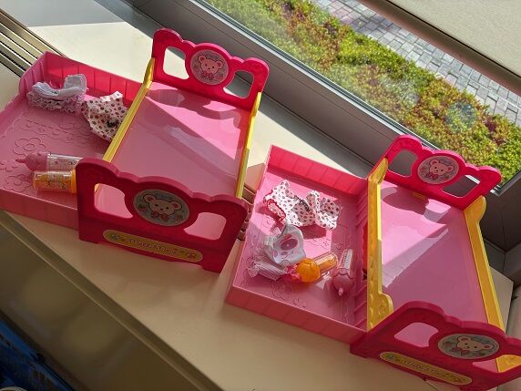 ぬいぐるみの位置がいろいろで、こどもなりのストーリーを感じます。くまさんには抱っこしてもらってます。