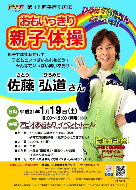 今年度は、ひろみちお兄さんこと佐藤弘道さんにお越しいただき、『おもいっきり親子体操』と題して開催いたします。