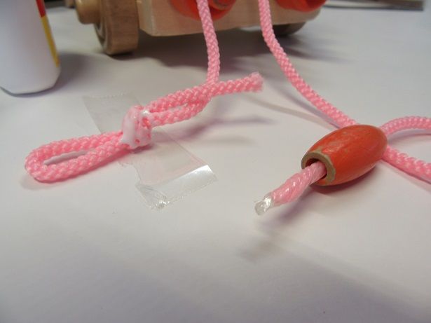 切れたヒモを引っ張り出して、新しいヒモを通します。