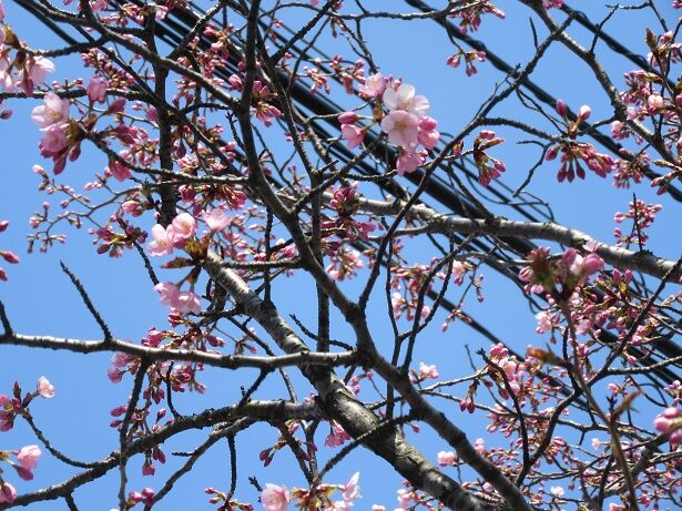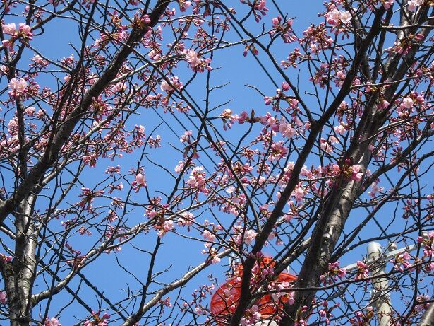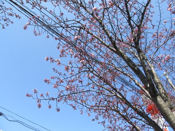 建物側と駐車場側に同じオオヤマザクラの木が並んでますが、いつも駐車場側の信号よりの木から咲き始めます。