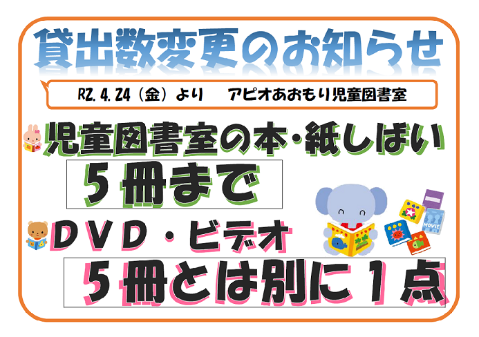 ということで、アピオあおもり児童図書室では、4月24日(金)より、子ども向けの本・DVD等の貸出本数を変更することといたしました。