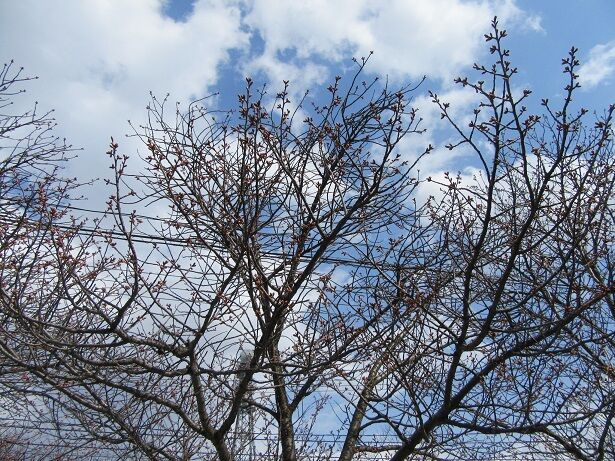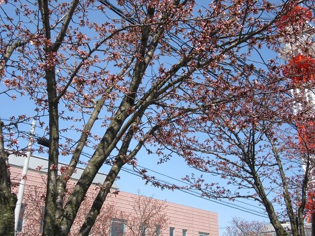 アピオあおもりのオオヤマザクラの蕾がふっくらと色づいてきました。