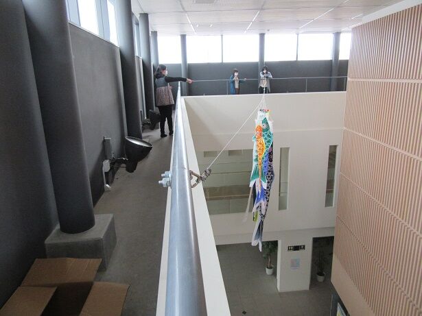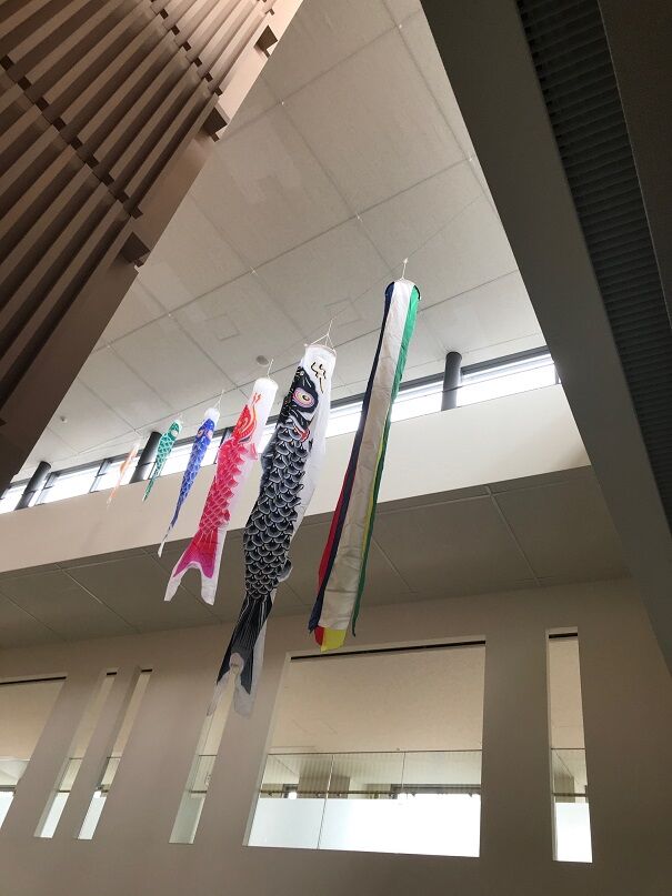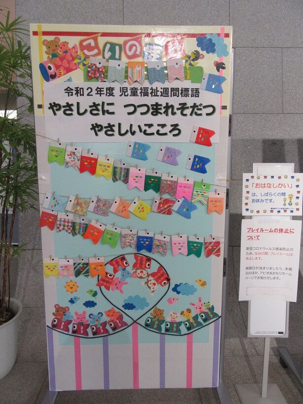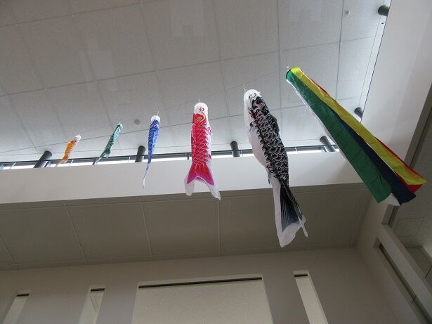 今年は新型コロナウィルス感染防止のため、皆さんの書いたり飾ったり持ち帰ったりを中止させていただき、スタッフが作ったたくさんの鯉のぼりをつけたパネルを置きました。