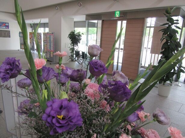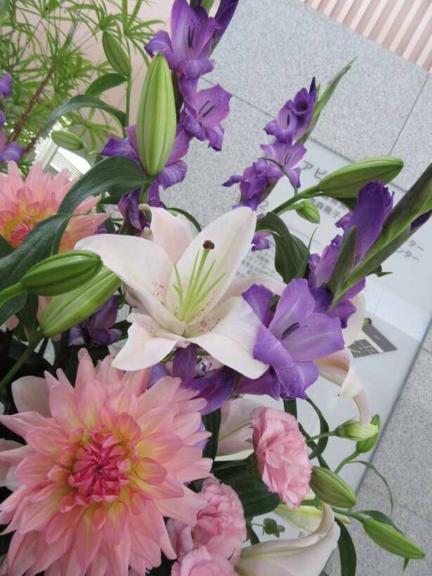 今回は、紫色のグラジオラス、ピンクとクリーム色のダリア、ユリが特に素敵です。
