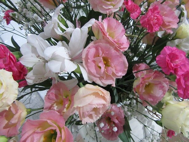 真っ白なアルストロメリア、クリーム色とピンク色のグラデーションのトルコキキョウなどなど、みんな美しいです。