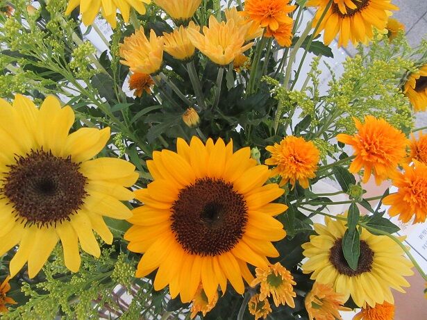 オレンジ色とレモン色のヒマワリ。黄色のコントラストがいいですね。絵画のようです。