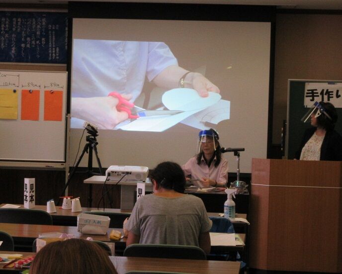 また、後ろの席からでもおもちゃの作り方が見えるように、初めて講師の手元をビデオ撮影し、プロジェクターで大きく投影してみました。