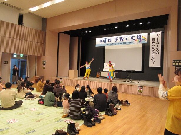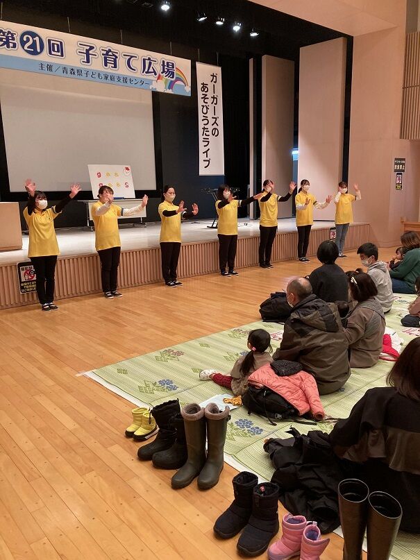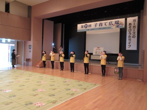 学生さん達と会場の皆さんの呼びかけにガ―ガーズさんが登場し、「あそびうたライブ」が始まりました。