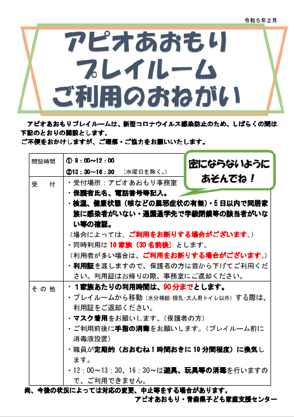 アピオあおもりプレイルームのご利用の際にはまだいくつか制限があり、ご協力をお願いしております。