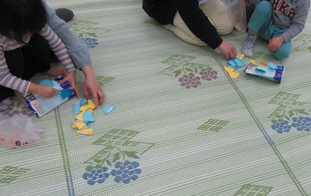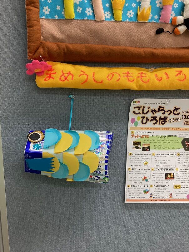 いろいろなチラシや「こいのぼりのおりかた」と折紙を入れた袋はどうぞお持ち帰りください。