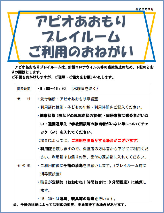 お知らせが遅れましたが、5月8日(月)より、アピオあおもりご利用のおねがいが次のように変わりました。