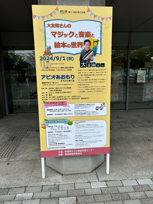 「第23回子育て広場 大友剛さんのマジックと音楽と絵本の世界」の看板が設置され、参加申込みの受付けを開始しました。
