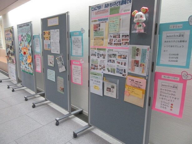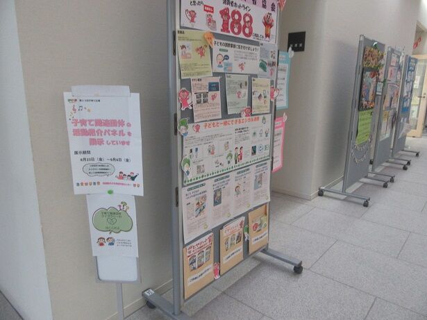 開催に向けて、1階プレイルーム近くの廊下に子育て関連の団体さんの活動紹介パネルが並びました。