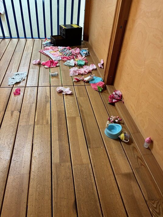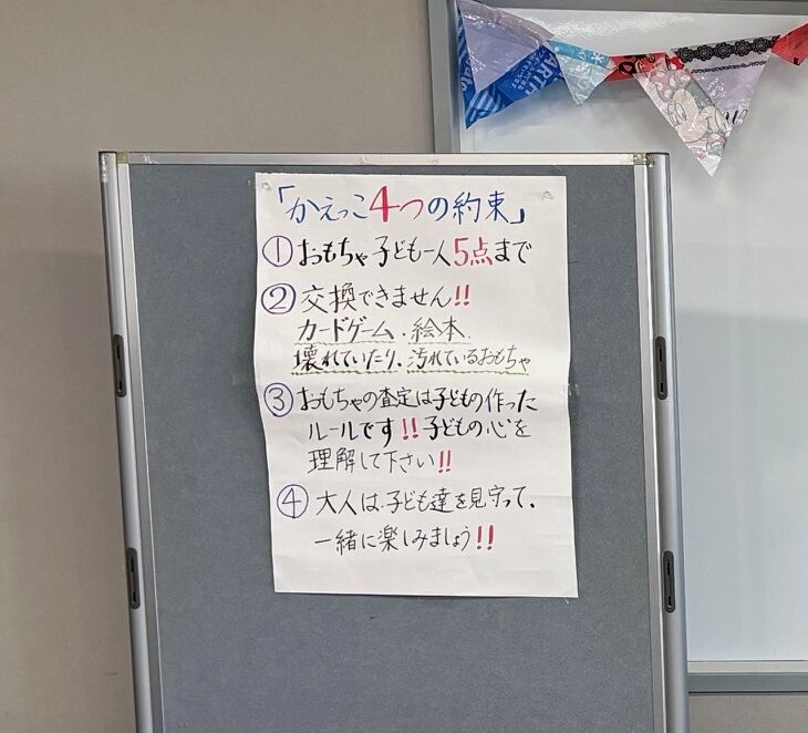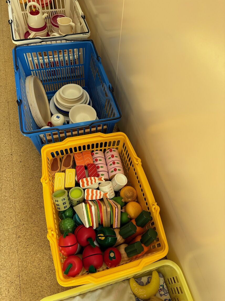 楽しく遊んでいた姿が思い浮かびありがたいのですが、あちこちに置かれたままのおもちゃを職員が一つ一つさがし出し片付けていると、勤務時間が過ぎてしまうのです。