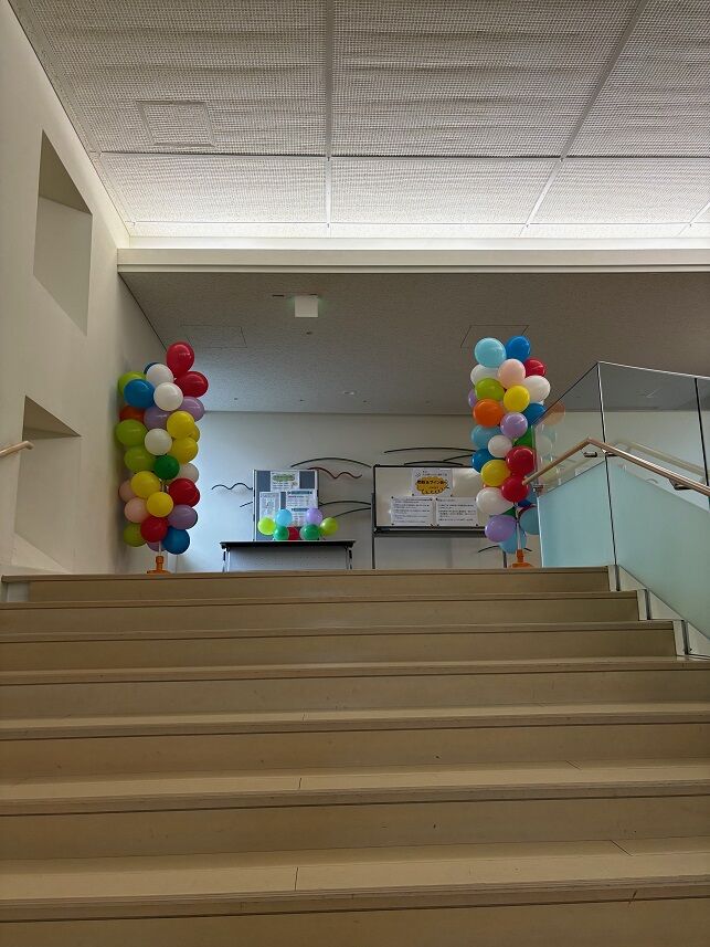 スタッフ手作りの大友さんパネルと風船ゲートでお出迎え!