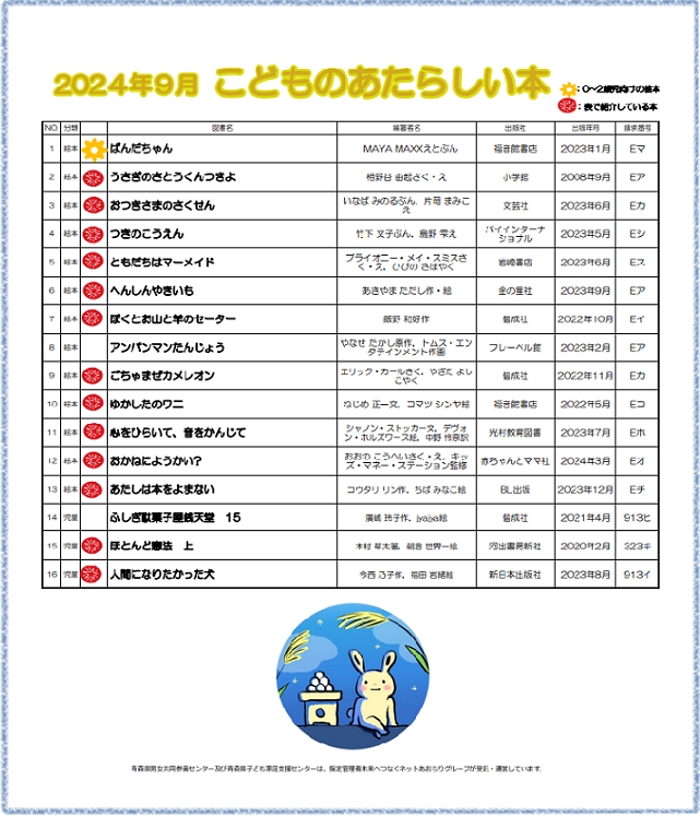 実は、改修工事のためアピオあおもりライブラリー・児童図書室が、9月15日(日)から10月3日(木)までお休みになってしまうので、読んでみたいな〜借りたいな〜という方はお早めに。