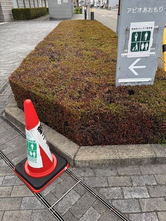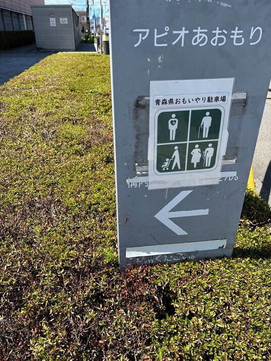 なお、こどもを連れて車でおいでの方は、アピオあおもり北側の建物に隣接したスペースに駐車できます。写真にもあるように「青森県おもいやり駐車場」です。