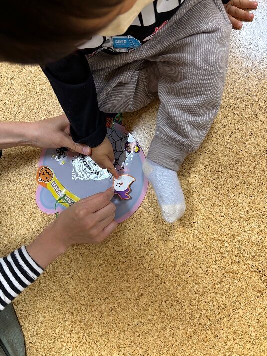 絵本・紙しばい・手あそびと楽しんだ後に、ハロウィンの飾りを作りました。