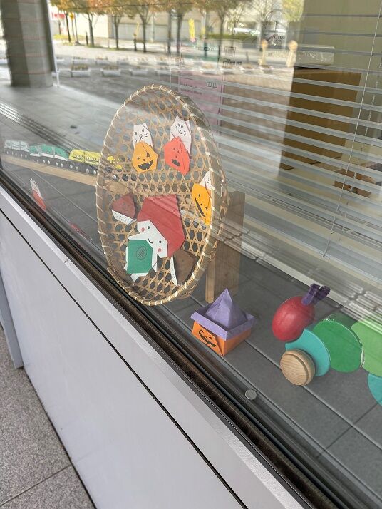 断捨離中の方から竹で編んだフタ付のザルをもらい、子ども家庭支援センタースタッフが「良いこと思いついた!」とハロウィン飾りに変身させました。どこに飾ったかな?