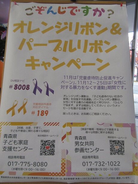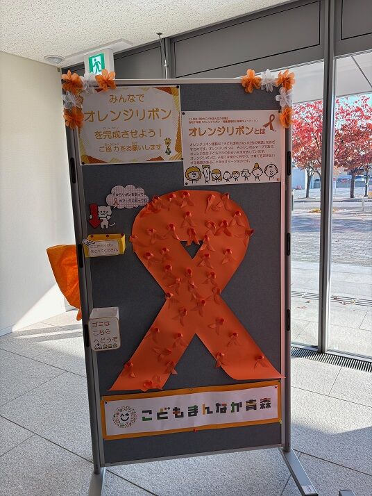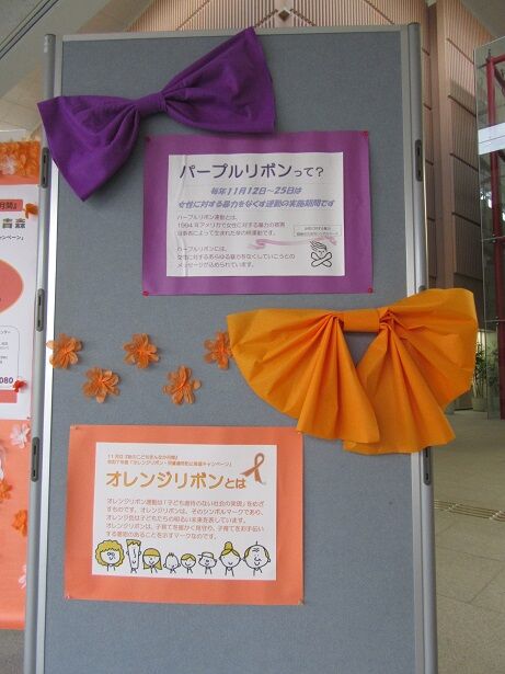 アピオあおもりは男女共同参画センターと子ども家庭支援センターの複合施設ということもあり、11月はオレンジリボンとパープルリボンをダブルで掲示しております。