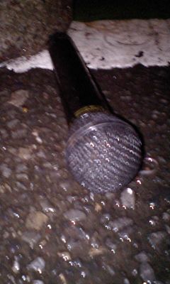 カラオケ屋さんの近くを通ったら、路上でマイクが雨に打たれていました。