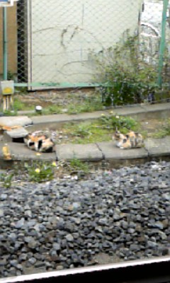線路沿いで、猫が2匹並んで日向ぼっこ。