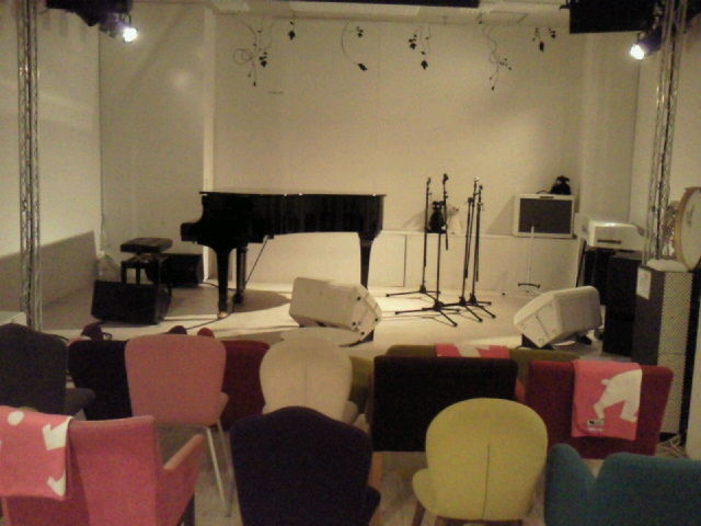 カラフルなソファ、真っ白なステージに黒いグランドピアノとぬいぐるみ、