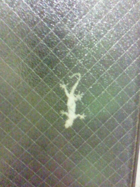 夜、マンションの入り口の横のガラスの向こうに・・・。