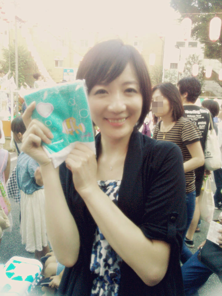 茜ちゃんの手にあゆみの郵便受けのお魚タオルが