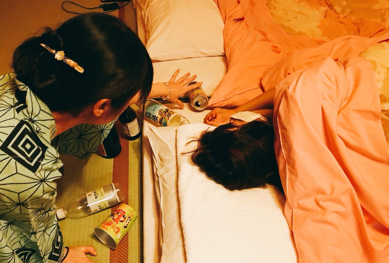 寝ちゃったさくらちゃんを何度も起こそうとする酔っ払いゆーやんを