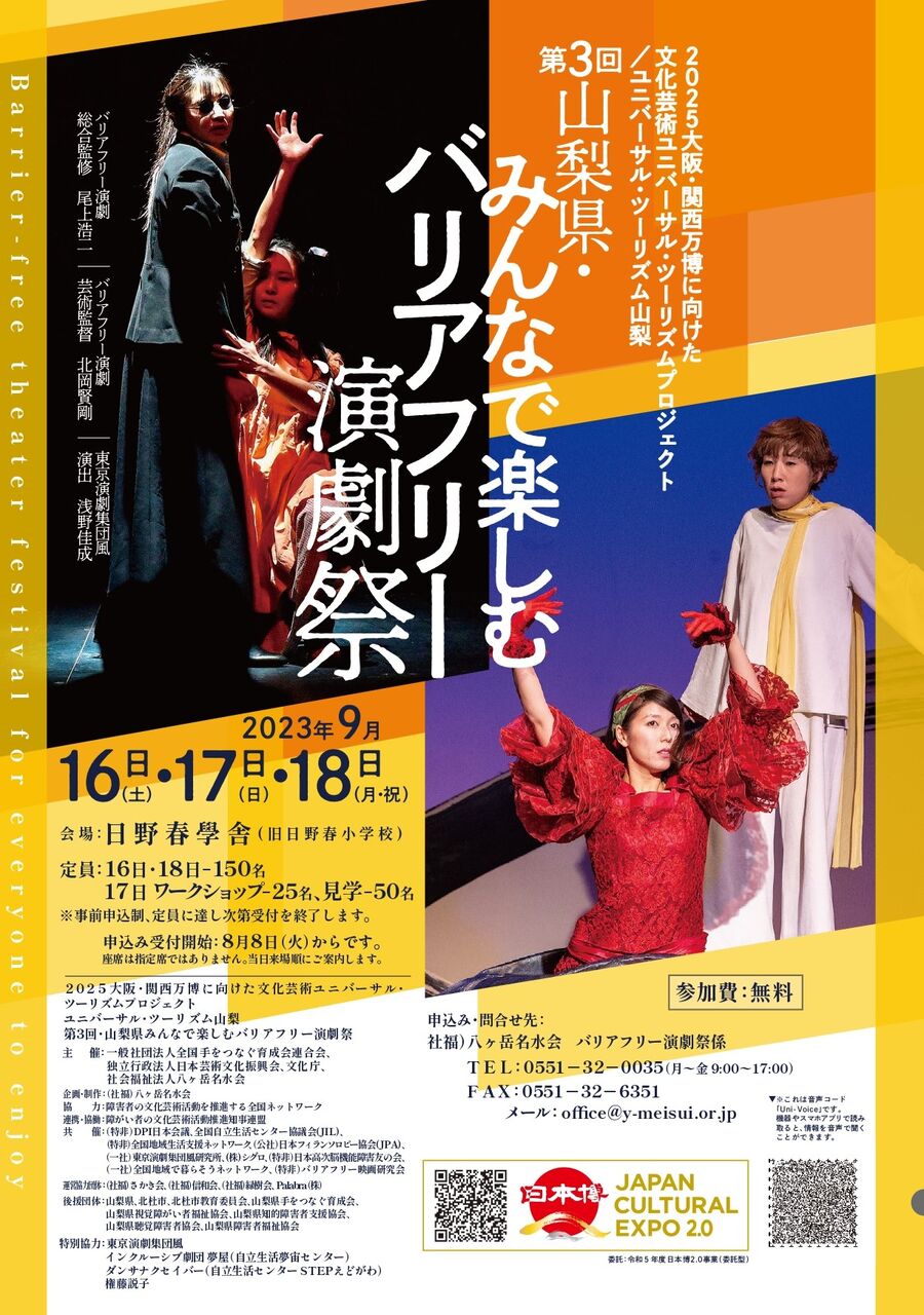 令和5年9月16日(土曜日)、17日(日曜日)、18日(月曜日祝日)の3日間、日野春學舎(ひのはるがくしゃ)を会場に「第3回山梨県・みんなで楽しむバリアフリー演劇祭」を開催いたします。