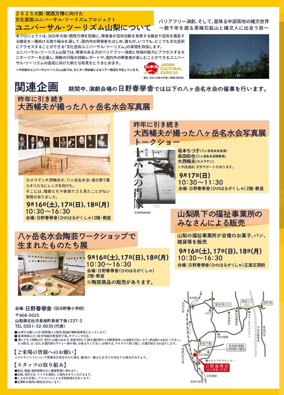 ※(注記)関連企画:期間中、演劇会場の日野春學舎(ひのはるがくしゃ)内で以下2.3.4.5の催事を行ないます。